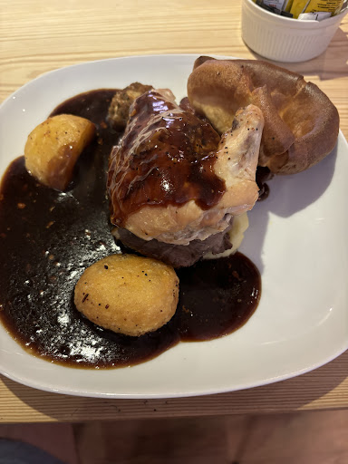 Went for Sunday roast for a big birthday as stopping nearby. The Christmas menu was only one available, still Christmas Dinner is essentially a Sunday roast whether it was an excuse to put up the price or if the Sunday roast is always over £15 we don't know as never been before. I had turkey, nice turkey. Hubby had pork, nice too he said. Roast potatoes OK but very difficult get a fork into, bit too crispy! Veg squares of carrot, ok; roast parsnips, yuck. Even son in law and our daughter didn't like them and they both normally like parsnips which to be fair I do not. Red cabbage, not sure what had been doing to the red cabbage but none of us enjoyed the taste. Sprouts well you always get sprouts with Christmas Dinner, sadly we don't really like them very much, nothing fancy done to them, just boiled sprouts. Sigh. The desserts weren't to my taste either, all seemed to have some kind of added alcohol, so a no from me. I had the small portion of dinner and although the turkey tasted nice there wasn't much of it really, stuffing was hard and overdone, the one tiny pig in blanket you needed a good eye to spot it, it was so small. The service was really slow, the people serving nice, don't get me wrong they were friendly, helpful and smiley. It just was a long wait for mains. The walk to the toilets my daughter reported to be an expedition as it was very cold! She had been warned by her dad that it was freezing as the door stood wide open, she put her coat on to go and came back with it clutched tightly around her! Thankfully I was saved from the trip as I didn't need to use the facilities for which I was very grateful. The meal was overpriced, the £7.95 or thereabouts for my smaller portion would have been a fairer price for the meal served. Luckily we don't live in the area, we were stopping nearby so won't...