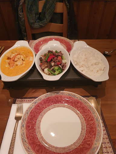 Called in on Saturday evening expecting to have needed a reservation but other than one other occupied table the place was empty. Could have been a bad sign but someone waiting for take-away helped. Cash only so quick trip to Spar needed. We went for a chicken and tofu starters requesting extra spicy which it was, all good. Then a good quality beef dish and green curry with mussels, both fresh and authentic tasting items with a decent coconut rice. We also had deserts, one a warm bananas in coconut milk offering and other 'thai custard' (which doesn't translate to UK custard in the least, more of slice of sweetened omelette) but probably didn't need them, not the highlight of the meal for us anyway. Three Singhas and a bill of £87 felt like the high side for out in the sticks as the main dishes were moderately...