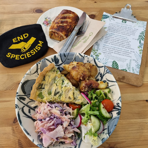 Read moreI went here with my family for lunch. My first issues was a staff member stroking a customers dog, then serving customers afterwards without washing her hands, disgusting behaviour. My two sons ordered a burger, which was extremely small in size with a few crisps, extremely expensive for such a small portion, my wife had a vegan BLT, which was over £8.00 for two slices of bread and vegan like bacon and a lettuce leaf and a slice of tomato. I had the smallest bit of quiche I've ever seen, with two side orders, The portion of quiche wasn't big enough to feed a child, never mind an adult, and it didn't taste of much, the two side salads were also small in size and not very flavoursome and were extremely oily. The only nice thing about out meal, was the drinks. It was more expensive than the local fish and chip. I wouldn't visit again here again, sorry to say, its the worst vegan cafe I've visited....