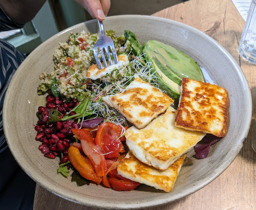 Read moreWe have been meaning to go to this cafe in years and finally managed a lunch time visit. It was open on a Monday which is useful as so many eateries can be closed this day of the week. Really lovely location with seating looking out to the town hall, and plenty of seating inside. The young staff were friendly and bubbly, the food choices had more interest than the usual cafe choices, mainly a Mediterranean style. Coffee was delicious. Prices were really reasonable and we would recommend this lovely little cafe...