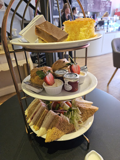 Read moreI booked for Tuesday 8th of April , as a mothers Day treat for my 75-year-old young mum . When we arrived, we were shown to our reserved table and offered either 2 hot drinks or 1 cold drink each included in our afternoon tea . Roughly 8 minutes after our hot drinks arrived came our gorgeously devine platter of goodies . There were lots included . Very fresh sandwiches 🥪 , tuna , cream cheese, and cucumber, ham and I think cheese and pickle. A nice portion of fresh salad, too . Then we had our large scones, and we had ours the cornish way , Jam first and cream on top . The moisture cakes on the top tier and boxed sweet treat was too much to have after everything else , so the friendly lady ( who was wearing a t shirt with a picture of her cats on , sorry we didn't get your name) swiftly got us a take home box and a bag to carry it in . What a lovely, friendly environment, and will return again soon . Dog friendly too ,...