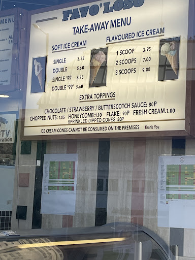 Read moreI visited here on Thursday 17th April. The takeaway window for ice cream is not open so you must go inside to order. Another lady was queuing there and we both waited for a long time. There seemed to be a lot of staff milling around trying to avoid eye contact with us. As I have a very young baby, so didn’t want to continue to wait with no service, I asked the lady who I had been standing with if she had been served at all. She said no, and that no one seemed to be taking any notice of her. I walked up to the till at the food order end and tried to get the attention of one of the young staff that had so far, completely ignored us. It took me a fair while to manage to get any of them to acknowledge me. I asked a younger girl if anyone was serving at the ice cream window. It was met with a “what?”, I repeated my question, “yes, I’m coming!” As if I should have known all this time while you ignored me! By this time another lady had entered with two children, and joined the queue. The girl came over and rudely said to me, “Well, how do I know who is first?” I explained that the lady in front of me was first, then me, then the lady with the two children. I asked for 2 single 99’s, which are £3.85 as per the photograph. She went on to charge me £9.80. I was a bit confused and asked if the cone cost more? She said, “No, the flake!” Reluctantly, I paid, but felt like she had overcharged me on purpose because I had deigned to ask if there was anyone serving. As you can see from the photograph, 2 single 99’s should have only cost me £7.70, so unless they’re displaying incorrect prices, I was overcharged and had rude service. I am exhausted from looking after a newborn, so just took my ice cream and left, but I won’t be returning in the future if this is the kind of service I should expect. So disappointing! I’ve lived in the Eastbourne area for nearly 3 years, and visited Favoloso quite a number of times, but this may be the last. Why would I pay to be treated so rudely, and made to overpay? The ice cream is generally nice, hence the 2 star rating, but not worth being...