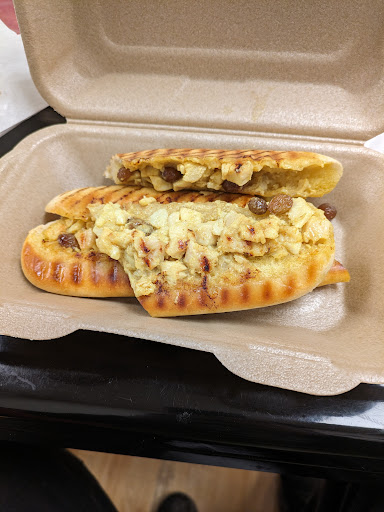 I am concerned about their food handling and cross-contamination though. I did not watch my sandwich being made but there was two small pieces of chicken hanging out of the edge of the sandwich - I am unsure whether they were supposed to be in there. The menu board didn't mention chicken in this sandwich at all. I'm not sure if the owners know what 'tikka' means (it's not always chicken!) There was also a bit of spiced fruit stuck to the bottom of my coffee cake, and I noticed a prawn in the tuna mayo pot, so they're clearly a bit slapdash with food prep. The sandwich was OK but the sausages were very poor quality so I wouldn't order this specific sandwich again. The coffee cake barely tasted of coffee - you could have told me it was cookies and cream flavour and I would have believed you (especially as it had chocolate chips on top - not typical for coffee cake). Thankfully I don't have any allergies so I would come here again but I'd order a different filling and keep a closer eye on the price this time. Service was quick and friendly so...