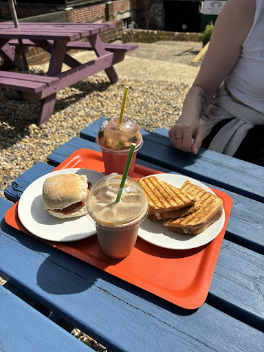 By the River sounded so lovely, and the location really was beautiful and so tranquil. However after waiting 25minutes I had to go down to the counter and was told the oven wasn't working to heat the beans. I made a different topping choice and collected two mugs of what looked liked slightly milky dishwater, these were our lattes. They had no taste of coffee and were warm not hot. A further 10 minutes later our food came out, unfortunately it was inedible ! I'm really not a fussy person and honestly will consume most hot food given to me. The jacket potato wasn't cooked through, cold and lumpy. The coronation chicken was curry powder mixed into mayonnaise, the chicken was very hard. The Hunters chicken toastie could have cracked the plate if dropped. The chicken was processed slices that were very dry, with some bacon fat and smothered in tomato ketchup. Very disappointed as we had a photo shot appointment and then a train to catch, so left hungry and...