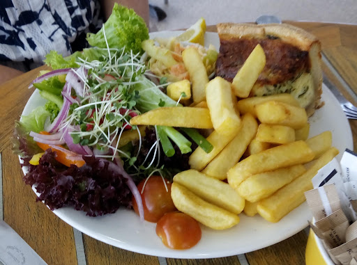 A triumph of style over substance. Donât get me wrong this is potentially a good little eaterie in a great location overlooking the harbour at Hamble with reasonably priced pay & display parking close by. The problem is it doesnât really know what it wants to be! The name and most of the offering suggests itâs a cafĂ© yet with red wine on the menu at ÂŁ29+ per bottle (there are cheaper ones!) and Veuve Clicquot champagne at ÂŁ55 per bottle you be forgiven for wondering if itâs a restaurant. A light and airy interior with decking and tables also outside and on the roof. Staffed manly by several young people, friendly enough but as usual they try hard but are poorly trained in customer service. Food ordering is at the counter (you have to conclude this yourself) and pay in advance for your order. Menu has a vast array (way too much!) choice and is supplemented by a âspecialsâ board. We chose Home-made âdeluxeâ fish pie & Salmon & watercress quiche. Home-made âdeluxeâ fish pie: Presentation (see image) could have been better. The addition of a few chips or small salad garnish would have lifted the expectation somewhat. The fish seemed to be salmon, and possibly cod in a pretty bland cheese mash devoid of any discernible seasoning or flavour. No prawns. Difficult to see where the âdeluxeâ element was? No perceptible sauce, just a watery base with the occasional scalding hot spot suggesting a pre-frozen offering. Quiche: By contrast to the fish pie the presentation was almost overload (see image) but visually it was so much better. Thatâs as far as it went however as the quiche whilst it had nice pastry was also pretty bland containing egg that seemed to have the consistency of being scrambled. The filling was dry and no apparent cheese. Conclusion: Undoubtedly this little gem will do well due to its location but it shouldnât stop the owners from improving as it wouldnât take much to make this a 5-star experience. However the owners need to decide if itâs a cafĂ© or a restaurant? Chop the menu down significantly, so much choice is bewildering and unnecessary and donât try to train the staff during peak times! (I was waiting (ignored) for several minutes to order lunch whilst the very pleasant staff member (it was her first day) was being taught how to use the coffee machine! Ordering at the counter is ok but it would be helpful if things were explained e.g. where the cutlery is? You can then watch while everyone seems to be doing something but achieves very little. Finally it costs nothing to say a cheery bye, bye, to every customer as they leave â our goodbyes werenât acknowledged at all. Incidentally the owner was occupying one of the tables but was engrossed on the telephone for most of the time without seemingly being aware. If it was me Iâd have been engaging with customers ensuring everything was as...