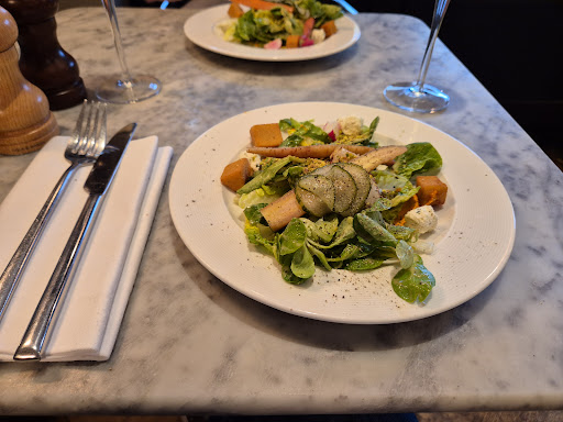 There was a group of us for lunch on a Monday. I can only assume that all experienced trained kitchen staff were off. I had a salad nicoise, a classic French meal. Sadly the kitchen had no idea how to prepare a salad. The tuna was cooked well and that was it. It was a pile of untrimmed lettuce leaves, looked like a whole lettuce, mottled dark outside leaves not trimmed, thick white stem and the small inner leaves not separated but cut in a wedge with all the stem on. The leaves were not torn or sliced just whole This person could never have seen a prepared salad. The anchovies tangled and buried under the steak, as were a few beans. A hard boiled egg from the fridge cut in half was thrown on the plate with a few cold from fridge new potatoes, cheap tasteless and seedy cherry tomatoes and a few hard green beans. There was zero presentation skills, especially as this salad can look beautiful it properly presented. On top of the tuna steak was a heap, a good dessert spoon, of black olive tapenade from a jar in the fridge, that was totally overpowering. The salad wasn’t dressed and I had to request some vinaigrette , which was good when it came. Is there no one to train staff? Have they ever eaten in France? Do not call yourself a French restaurant if you have no finesse. My friends all had ice cream. It was served with massive dessert spoons, the large teaspoons on the table were the correct size.