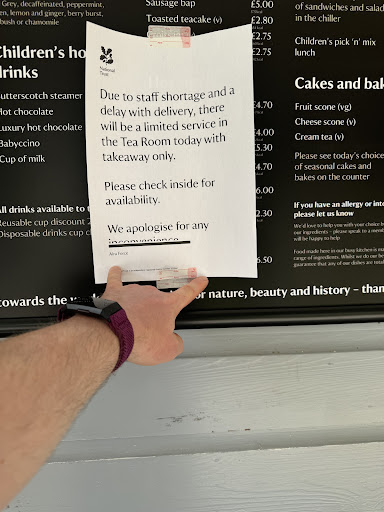 If you plan a day, maybe you will come onto Google check food and transport availability. So it is disappointing having found parking, times of Ulswater steamers (not steam powered btw?) that the tea room near a waterfall has this. The food available was indeed reduced. There are only 2 staff, but one was having quite the time of it cleaning a bin out and educating people on what has to go in which bin and hysterics because a disposable nappy had been put in the recycle bin.