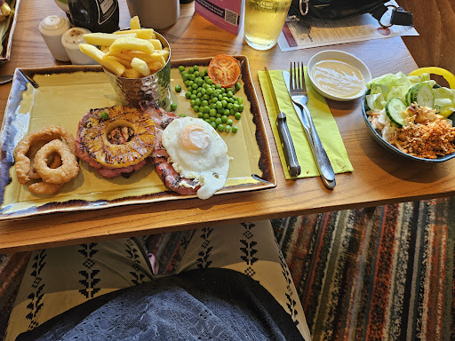Uncomfortable experience as I was alone staying in this beautiful area, i never got chance to look at the menu as the young lady came over as soon as i got seated by a nice young man and asked what do i want to order, so i ordered a Chardonnay which was put on the table warm ( a large one) which i discovered after i finally found the salad bar, come back to my table and sat down, my wine was then moved out of the way and my main meal was put in front of me when she could see i was starting my salad, after getting over the shock of this persons rudeness, i found the fish was paper thin, the batter hard, greasy and not very warm, the handful of skinny fries and the peas stone cold, i did order mushy peas, but when i went and found my server she was abrupt as if i was inconveniencing her, she then came back with a dirty scratched mug with some mushy peas inside and threw them on the table, needless to say, i barely ate a thing, very disappointing visit and i think it has put me off Harvester Restaurants for good, an utter...