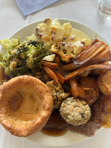 The Sunday carvery was very nice, three types of meat & a good choice of vegetables, the problem was when queuing for your food, you are standing across the entrance to the bar, so staff collecting drinks from the bar this makes queuing a bit more difficult! The tables had nice white tablecloths, because of how close the tables were it made getting into your seat or out not so easy! When we arrived we didn't know where to wait to be seated & waited by the till, the member of staff was busy taking food orders & when another member of staff came we asked them! The food...
