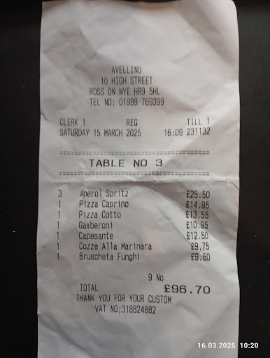 Read moreVary rarely there's a place that does everything well. The Avellino team does. It's difficult if you have special dietary requirements, like allergies. I have an allergy and two intolerances & my Mrs has an intolerance and an allergy, we feel very comfortable eating here. I spoke with Loni, (apologies for incorrect spelling). He can advise against dishes containing allergens. The cutlery is clean. The glassware is clean and not chipped or cracked. The crockery is also immaculate. The tables are always clean. The draught's are properly chilled and don't taste like the lines haven't been cleaned in a long time. The front of house staff are always immaculately presented and service is of the highest quality. The cocktails are exquisite and if you fancy one but don't want alcohol, there is a mocktail menu also. They cater for veggie and gluten free. They have a lovely, large open space dining room. I dropped my fork, the cutlery is back end heavy. By the time I had picked it up he had come over with a replacement. It's almost silver service and Michelin cuisine but for a very reasonable price. The menu is a mixture of Italian and Greek influences. But the product is purely indulgent. Which brings me to, desert. If you can permit the calories the desert menu is a sweet tooth paradise. Excellent coffee. Most of my reviews are 1 star, I acknowledge I'm difficult to please and often heavily critical. This time, if there was a 6th star I would have...