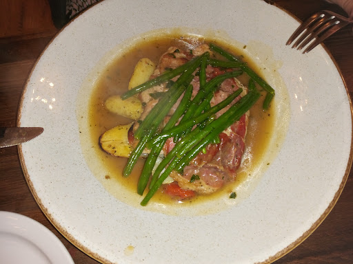 Bass, prawns, mussels and potatoes in tomato sauce: 18£ but honestly struggled to fault. Every bit of seafood on the plate was cooked perfectly (not over/underdone), all had good flavour. Potatoes were beautifully cooked (sweet, slightly crispy) and tomato sauce deliciously especially with fresh lemon juice. ONE OF NICEST COOKED MEALS I HAVE HAD IN A WHILE. If Im nit picking/forced to give one criticism: maybe seasoning could have been more even on seafood? Some eg prawns/mussels quite bit more salty than others.