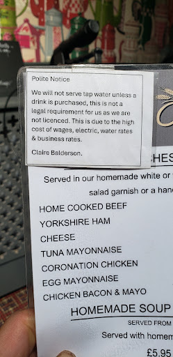 Read moreMediocre food in what looks from the outside to be a decent welcoming tea shop and bakery. In reality utterly spoit by the mean spirited, and jobs-worth attitude of rude staff members like "Connie" (who knows if it's her real name?) who'll let you spend over £50, and then ARGUE OVER PROVIDINGA GLASS OF SIMPLE TAP WATER! Whole visit totally spoilt by the complete small minded attitude of a staff member. Here's the thing... the menu makes it very clear that a glass of tap water IS available as long as you order another drink. I was travelling with visitors from the US who ALWAYS want a glass of water with another drink and meal. We had three over priced drinks with our meal anyway, and the girl still wanted to argue over providing ONE glass of tap water!! ...lost for words I am affraid... Unbelievable. Pathetic... and probably just representative of mean spirited management hiding in the back. She said she'd get someone at one point during the back a forth... no one came out. Who knows? Love for the owner to reply to how the "rules" are being enforced.