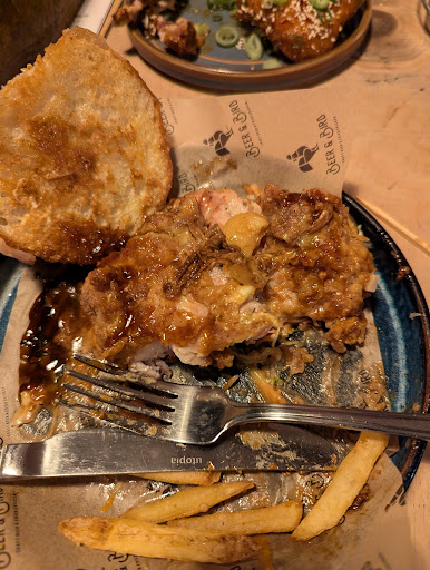 Ā Ā Ā Read moreFirstly, read reviews about cancelled bookings with no explanation. Strange times regarding staff shortages ... intended to visit early evening of Monday 10th October, but it was completely closed. Not to be put off, phoned on Wednesday and was happy that the call was answered and told a walk-in wouldn't be a problem. Two of us with dog walked to the door around 7:15pm. Stairs quite steep so carried dog (easily came down). Friendly welcome and drinks order taken, quickly followed by food order. Asked if dog needed water, which was gratefully received. She Who Knows Better not that hungry, so bunless with salad would be good option, however, not available š Chicken Tenders would have been an alternative, but ordering fries and coleslaw was a silly price so Nasville Coq (included fries) was the only sensible option. I ordered the K-Pop ... THE BEST CHICKEN BURGER I HAVE HAD, moist/foursome and good portion with a good brioche bun .. REALLY loved the pickled ginger (but burger not as spicy as indicated). Upgraded to Sweet Potatoe fries which were OK. Coleslaw was actually inside the bun, and so just a small portion. Happy Hour 2xcocktail disappointing as 'full' crushed ice spoiled the drink. Hard to drink through straw, little substance (was however called a cooler). Would be nice if 2x offer of ALL cocktails available throughout evening. Beers (West Coast IPA) great ... flatish but tasty. After paying, completely ignored by all the staff who were by the bar, felt like they were not bothered we were there at all. Toilets a little trek up two flights with the 'double entendre' of the menu carried on .. Chicks and...
