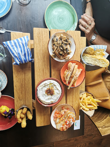 Read moreUnfortunately, the food today wasn't great. The bread was very stale and the waiter told us that it was meant to be this way. I appreciate that bruschetta is supposed to be crunchy, however there is a huge difference between stale and crisp. The cheesy garlic bread was also clearly toasted stale bread, which was very disappointing, though my hungry little boy happily ate it. The halloumi fries seemed like they were bought in cheap, not freshly prepared. The coq'n'balls were absolutely delicious and by far the best thing we had, but they lacked the honey and harrissa flavours that were stated on the menu. The portion sizes were all generous. I love the serving bench the food came on and the floral archway, but the decor is very mis-matched.