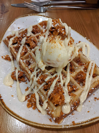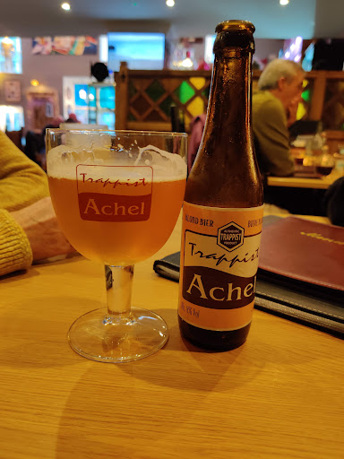 It was a wonderful and felt like an authentic Belgian environment. The menu isn't large but does just enough to give you some options. We didn't indulge in starters but I did partake in a Raspberry wheat beer that was sweet, fruity and had a sour finish. My father and I had the chicken schnitzel. Schnitzel is one of my absolute favourite meals, unfortunately for bier huis my expectations were very high. It was OK, the chicken was a little over done and dry. This would normally be OK because schnitzel very often has plenty of mushroom sauce. This version had sauce but the portion certainly wasn't a generous one. The bier huis burger was beautiful according to the member in our party. The bun was light and the meat was thick and perfectly cooked. The fries with it (and the schnitzel) if I didn't know any better I think must have been cooked in beef dripping, they were delicious. The vegan burger came with sweet potato fries which were not cooked in beef as they were vegan, were described as absolutely perfect by my partner. One of the ordinary fries landed on the vegan plate and the staff were quick to warn us, taking the vegan element of the meal separately. The vegan burger itself was very nice but it fell apart quite easily. Cutting the burger in half to make eating it easier caused it to collapse a little. Collapsed or not it remained tasty. Waffles were large, well balanced, light and crispy with generous toppings. Our advice is to order the simple waffles and add toppings as this works out slightly cheaper. The clotted cream is not too rich and renders the squirty cream being on the menu pointless. The staff were friendly and...