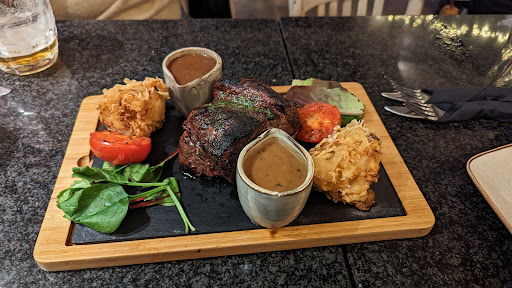 Upon returning in the evening we were once again greeted by friendly and welcoming staff. We ordered our drinks alongside a haddock and porter house. The staff were very attentive and and the atmosphere warming. Out food arrived surprisingly quick and looked beautiful. The haddock was fresh and crispy and complemented perfectly by the pea and mint puree. The steak was perfectly cooked and went with the Rick pepper or sauce.