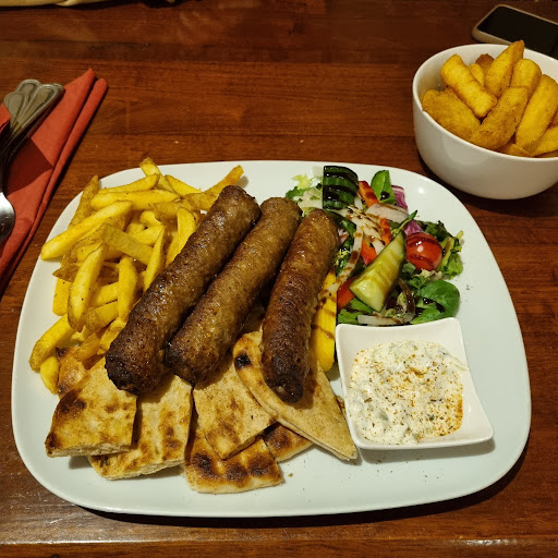 We perused the extensive and interesting menu and chose four different dishes: chicken souvlaki, stuffed beef and lamb kofta (both served with chips, salad, pitta and tzatziki), chicken curry served with rice and poppadom and finally a sizzler dish of duck breast which came with a choice of sauce (we had plum), peppers, onions, and a choice of either fries, chips or rice and salad.