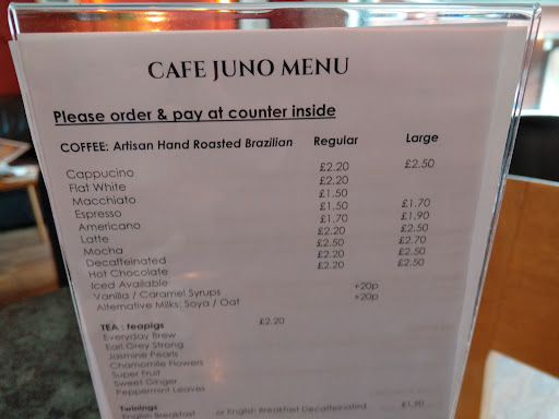 I have just returned home from a shopping trip in Chester with my daughter. For lunch we visited Cafe Juno. What a lovely experience! We sat outside in the seating area in the sun. I must say that the coffee is the best I’ve ever tasted, It was so smooth and full of flavour. I had a Latte initially but was so impressed I then ordered a flat White which was even nicer. We both ordered the pizza panini which was absolutely delicious, so fresh. It was served piping hot with a side salad and tasty dressing. We couldn’t fit in a dessert but I did try a fresh lemonade to finish. It was very refreshing, served with ice in a handy take out plastic cup which I took with me. My daughter had a can of orange. We found all the staff very friendly and seemed to know a lot of customers by name, which I liked. We visited the toilets before leaving and were surprised to see a lovely little comfy seating area upstairs with cushions and books (adult and children’s). The toilets were clean and tidy with adequate facilities. Overall, it was a very pleasant experience and very reasonably priced. We will be...