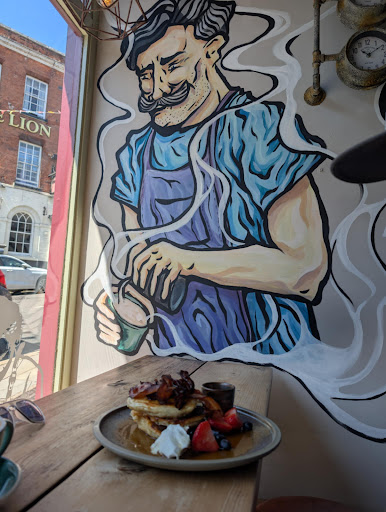 Read moreWow! What a little gem. Visited this delightful cafe when taking our dog to the animal hospital in Shrewsbury. I had a latte, stack of pancakes with mascarpone, fruit and crispy bacon. In honesty the bacon was a little crispy for me but the smoky, salty flavour juxtaposed the sweet fruit and fluffy pancakes. The coffee was smooth and rich in flavour, no bitter after notes. My partner had one of the many iced teas made fresh to order and she was not disappointed either. We had a lovely seat in the window and could admire the Tudor architecture and busy street. The interior was nicely decorated, restroom was clean and the host was a wonderful lady who we felt took genuine interest in us. She offered her patrons a cheery hello and goodbye and the rest of her team were friendly and inviting. We did not feel rushed during our visit and only wish we lived closer so we can enjoy this lovely cafe again. It may seem a little cramped at first when you walk in but seating is comfortable and this cosy cafe must not be missed on your trip into Shrewsbury. We spent approx. £13 per person for the...