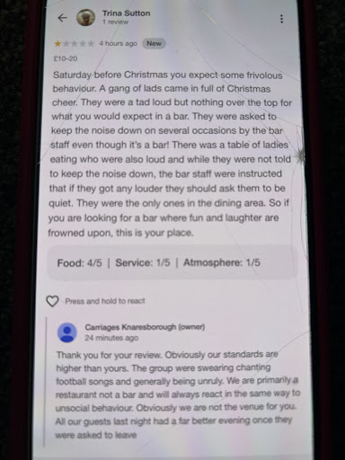 You seemed obsessed we were not locals and didn't recognise us. To be fair I have never seen you before in the pub, it is usually younger staff behind the bar. You only introduced yourself as owner when I asked to speak to the manager.