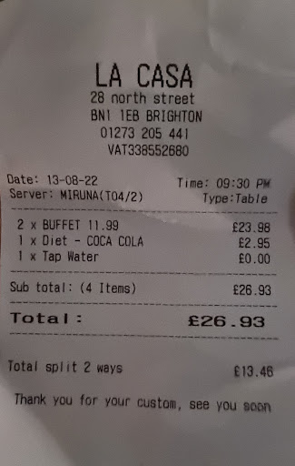 Me and my friend decided we would try something new and have a quick bit to eat at Casa Della Pizza... what a mistake. We looked up at the sign inside the shop which said all you can eat is only £5.99 so we thought hey, why not. Little did we know in tiny letters it said Friday-Sunday £7.99. We were shocked when we saw the bill. Not realising, we thought we could share 1 plate between us however this was not the case. We got our one plate and started piling on the food. We then sat down and started to eat but some waitress came over to us and told us we could not share. She then asked me if I wanted a plate not making it clear that I also would have to pay £7.99. Complete rip off. The food was very poor, in fact it was below average. The food was cold and there was hardly any pizza or garlic sticks left which was the main excitement. I decided to not touch the plate the lady had given me as i didn't want to pay. I simply ate 1 olive while my friend forced down some soggy bland onion rings and chewed on some under cooked chicken. He then decided he was full so we asked for the bill and to our surprise they had charged us for 2 meals. The bill was over £15! We spoke to the lady who told us I had to pay because she had "seen me eating food off my friends plate" which was a complete lie. We refused to pay for my plate, especially after finding out we had been scammed and it was almost £8 each anyway. She went to find the manager who spoke to my friend and stated that we should have known we couldn't share and that it wasn't his problem. My friend said yes I understand but it didn't say anywhere that we couldn't. Then getting really frustrated the man said that we had been here before and that we had done the exact same thing. Utter lies once again. We both said we had never been before and this was our first time. After a lot of huffing and puffing he finally gave in and allowed us to only pay half the bill. He told us we could not do this again and we replied don't worry we wont be back. All in all the service was satisfactory the atmosphere was a bit groggy but hey what do you expect. Also the food was pretty terrible. The one star I am giving is for the one olive I had because to be honest that was the only nice thing and the only thing I had that whole time...
