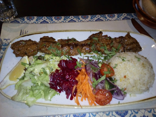For mains we both chose the “mixed grill”, which consisted of a chicken kebab, a lamb kebab and a lamb adana served with rice and a salad. This was almost too much to eat (and I have quite an appetite). The meats were cooked to perfection and the delicately flavoured rice proved to be a perfect foil to the other tastes. The other main courses I saw served included a salmon kebab (which looked wonderful) and a poussin which looked huge. Judging by the looks on other people’s faces, all were good. The baklava desert was excellent and served with a small scoop of ice cream, which proved to be just enough to stop it sticking to my teeth. The baklava lived up to the quality of the starters and mains. Excellent.