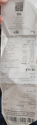 Read moreVisited Chi Northampton as a a family of 2 and a half. (7 month old) Initial thoughts when arriving was that there is No step free access! We had a pushchair so needed to lift this up the stairs. How they are allowed to have no step free access in 2024 is a bit unfair as I’m sure others with young children or disabled diners would struggle to access the restaurant! When asked they mentioned something about a ramp waiting to be installed and being able to access from the back. We didn’t see any signage for this, and we’re not offered this route on departure! The restaurant was not busy and our order was taken, we ordered 2 drinks, 2 starters a main and 2 sides, this came to £66! We felt this was extremely expensive, not to mention the 12.5% service charge and the fact the servers didn’t go above or beyond! They also got one of the starters wrong so had to get that changed. The bill also doubled up on items but the price would say £0.00 for duplicates. When questioned the waitress took 10 mins to let us know they are just duplicates but we are not charged extra. What was the point? Could be very confusing to customers. They also advertise NHS discount on the live boards on the Sol central building but when we asked the server claimed they do not offer this as the manager decided not to go ahead with offering the discount. Misleading for diners. Overall, the food was average and way overpriced, service was not worth 12.5%. Bill was confusing and they need to rethink their...