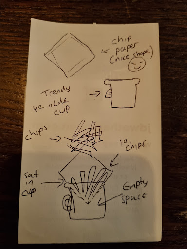 Paid £3.50 for a side of sweet potato fries, came out looking all glamorous and full. Then the dastardly grease paper stuck up two fingers then laughed at me! 🤣 I was mugged off so much I went to the effort to make a diagram of this tomfoolery tactic! (See pic) I wouldn't put this down to the staff, kitchen or front of house.. more the penny pinching head office setting portion sizes. Sorry there was no before photo.. I was so swept up in the emotion of being fed and it looked soooo good.. it never occurred to me to document it! Also after reading similar experiences i believe im justified in my opinion about chips portions!! Similar dastardly tactics also applied to my tiny main meal (big plate, but massive rim with small food area in the middle) however.. despite my tiny portion (of bang bang chicken) it did taste good.. and dragged the review up (because of the chip malarkey debacle) from a 1, to a 2 star review. Service was with a smile, but could be improved. I was met at the door then given a table. Then after browsing the menu delights I waited patiently for service.. then waited.. then waited.. only after seeing another guy go to the bar to order did I realise I had to do that! No issue with going to the bar to order whatsoever (I've been to a spoons before) but.. it would have been nice to have been told as I walked in so I don't spend the next hour looking at the menu.. then looking up with no response constantly. Also, my pudding I paid for never arrived? Forgotton I guess? Also no option for a tab? Unusual for a restaurant? Don't they trust me? (In fairness i wouldn't trust me!) So had to pay the lot up front which was a pain. I'm not psychic so I don't know if I'd like 10 drinks..or be so upset about the chips I only want one drink!! Or perhaps a pudding after to console me? Maybe a sponge pudding to soak up my tears?? Or coffee to get me over being so upset/angry/depressed? I appreciate you can pay as you go, but that doesn't help guy that needs my food and drink bill all on one receipt. Is offering a tab simply impossible?