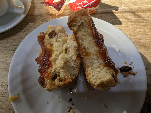 Had pot of tea inside and bought 2 fruit scones to take home. Don't know how old they were but hard as rock and certainly not fresh. Never again. Very disappointing. Judging by some responses I have seen from the owner I cant see anything improving. Go to Henry's. They know how to make scones