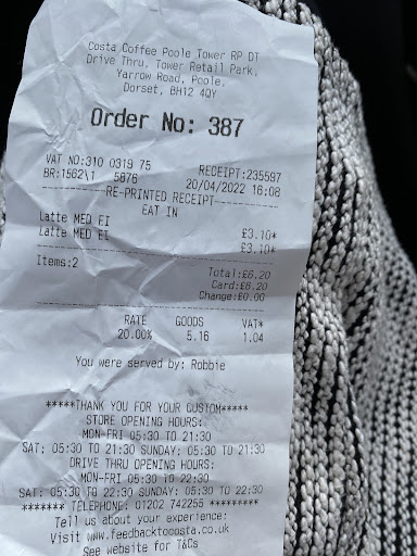 Read moreThe coffee tastes really bitter, not nice at all. On three occasions I’ve ordered a cappuccino and they have all tasted the same, really bitter and undrinkable. I’ve had plenty of other costa coffees and they certainly don’t taste extremely bitter. When I spoke to the manager, she was quite defensive and said it was fine and maybe I should add syrup or a sweetener! I don’t take sugar in coffee and shouldn’t need to add it. Unfortunately a really poor experience here. I don’t usually leave reviews but the price is expensive enough so I’d expect my coffee to be drinkable. Certainly will avoid this place in future. Staff were not very friendly and I asked quite politely and friendly for a replacement coffee which still tasted sour and bitter. Manager was very dismissive and not understanding. Coffee should certainly not taste that bad especially when it’s Costa, they should know better. Will not be returning here in future. Very...