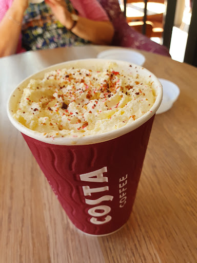 I found myself a table & took a sip but my hot chocolate was almost stone cold, so I decided to go & ask for a replacement, I could see that he wasn't happy but the manager i think he was just said that he will bring it over to me when it's ready, i waited quite a while in this loud & very dirty Costa as so many kids were screaming their heads off, then i saw the same young man walking towards me with my new drink & not the manager as agreed, he put it down & I thanked him but he just ignored me & walked off, unfortunately I took a sip but I am sure that it was the same drink as it was almost stone cold plus it didn't taste of white chocolate in the slightest, as I was thinking that it could be far too sweet for my taste buds but it just resembled bland milk, very disappointing at almost £4 & next time I will try the 2nd Costa further up the road that I didn't know existed until today which is probably where everyone else was going when they left the queue...