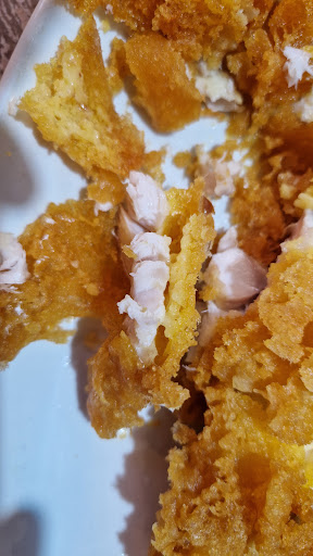 The batter was quite bizarre for a fish and chip shop. It was incredibly crumbly and just fell apart so you couldn't really keep it attached to and eat it with the fish. It tasted very strange and was wet and kind of eggy in middle. Most batters I've had are white in the middle, not yellow.