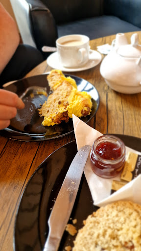 The cafe environment was both clean and welcoming . The staff were friendly which immediately ticked boxes!! This was a huge plus. Nothing worse than miserable and grumpy staff. Friendly, happy, polite but fun staff make a difference. We had scones, a fruit scone with jam and cream which had a consistency rather fruit crumble esque and was delicious. We had a Stilton scone which in essence was very good but a tad salty. We had two lattes and in total was around twenty one pounds. Our personal preference would have been for the butter, cream and jam to have not been served in plastic one serve catering portions. This review is as we found it, honest with pros and cons and we...