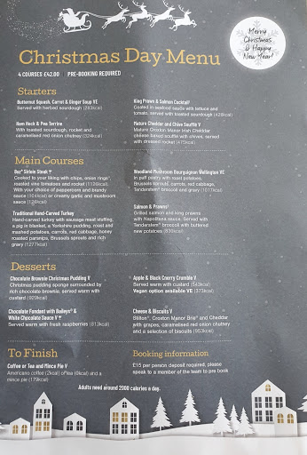 First main course was served to our table at 4.22pm. It was missing pigs in blankets and only had 2 sprouts and 2 small slivers of carrot. It was however real turkey and the gravy was nice. When asked about the missing pigs in blankets we were told they had been ruined overnight. Again no explanation or apology beforehand. Yet again we had to ask for 3 of our main meals as they never showed up with the first 8. 2 of these waited for meals were steak ordered medium rare, when they finally arrived both were well done and the chips were burnt. Those meals never got ate. We lost another member of our party at this point, they left hungry and very upset. 1