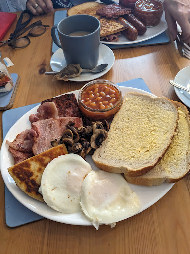 Initially the bacon seemed undercooked, half warm, with completely unrendered white fat; the black pudding was so mushy it seemed barely defrosted; the 'square sausage' lorne I couldn't eat past the first bite feeling like I was eating tartare, and gave to the dog.