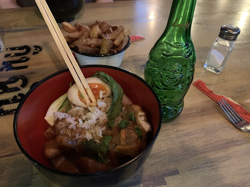 Spicy Asian Vegan Donburi Rice Bowl £13. A large bowl. Really nice and I like spice but it overpowered me and my partner who likes a Phall! It wasn’t a hidden depth of spice in the mouth which is tolerable, but a nasty sting to the tip of the tongue with dissipated after 10 mins. I think it was from the hot Paprika powder scattered all over it. It tasted good but too harsh.
