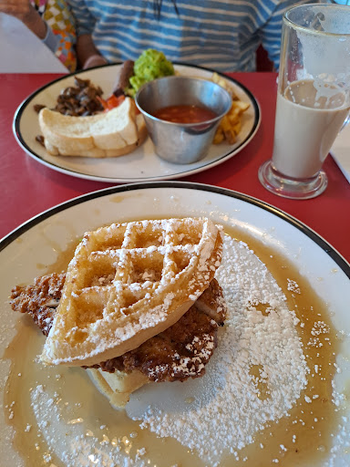 Breakfasts finally arrived a good hour after we ordered, my chicken consisted of a large goujon in a maple better, with half a waffle and a good dose of maple syrup, i was left slightly disappointed with the portion size and minimal amount of chicken. Food tasted fine though.