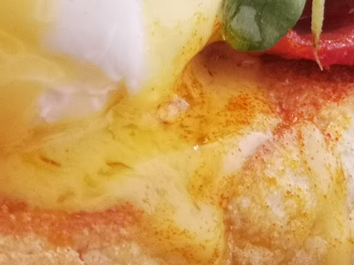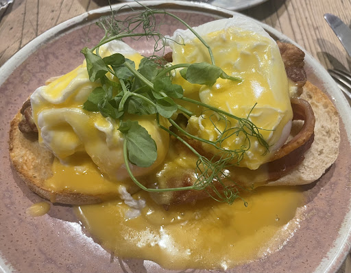 The eggs benedict was gorgeous. Crisp buttery sourdough Muffins. I.e. Soft inside with a nicely browned & caramelised exterior (fried in butter by the taste, but that may be the hollandaise) . May be completely off base but these muffins tasted like sourdough (had the 'tang' in a very good way). Non-greasy, very crisp Bacon (but not so crisp it was shard like or 'shattering'). Poached eggs thoughtfully topped with very young basil (more flavour than old) & pea shoots. Ben (the head chef) later told me there was Amaranth but I admit to unfortunately missing that! 😅😂 Finishers; A paprika dusting with chill flakes and a young(?) olive oil around the edge of the plate was a nice touch. Oil was added in only a very small amount, tasted peppery, 'green'/herbaceous(for lack of a better word and my poor palate 😂) and added noticeably to the sourdough muffins flavour (complimentary to charred flavours & 'sour' tang).