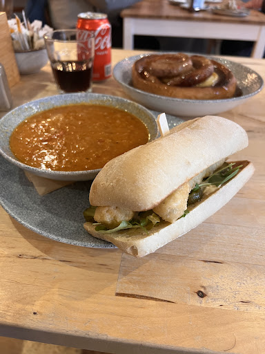 A beautiful sunny morning and our first after a wonderful week of walking the Cumbria Way with smiley faces at every place we stayed and stopped. We arrived about 10:30 and I side a sign asks you to wait to be seated. When we were approached I asked if we could possibly sit at the sunny table by the window as there were two tables for two people. I was abruptly told that wasn't possible as apparently some of the cafe was closed off. We were given a table inside and then ordered a bap and fruit loaf and two coffees from the till area. The coffees arrived after a few minutes later but the food was at least another ten minutes by which time we had drunk the coffee in order that it was hot. I prefer the coffee and food together but didn't think I needed to ask for that to happen. After we'd been there about 15 minutes a single gentleman came in and sat at the sunny table and was not asked to move. It all left me feeling slightly intolerant of the manner of the employer or owner of this cafe. The coffee was okay. The bap quite tasty. The fruit loaf is the same as Starbucks with strawberry jam in a packet. No...