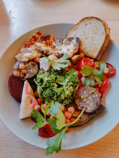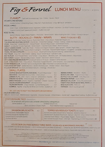 Read moreI visited yesterday and was looking for a destination half way between my home city and my sons home. Poynton seemed to fit the bill and looking at the various places to eat I chose Fig and Fennel. It is a great cafe with a very friendly relaxed atmosphere. It's well decorated and spotlessly clean. The staff are young, very friendly and helpful. They allow in dogs and have several especially designated tables which means customers, who are not keen, can get away from pets. My dog also received a sausage of her own. I'm told local dogs drag their owners in for more of these yummy treats. We had lunch here after a walk along the canal ( not too far away ) there is a good choice of food and I had difficulty deciding 😀 but opted for the burger. It was delicious 😋 Two delicious burgers between a brioche bun, well cooked onions, melted cheese and a lightly spiced pickle, with salad. A side order of chips. The food was well presented and hot. My son opted for the same but there were some other delicious options such as flatbread with goats cheese beetroot and salads, They specialise in Mediterranean and locally sourced foods and have a fennel sausage. All in all a great relaxed feel and good food. No wonder many of the locals were using...
