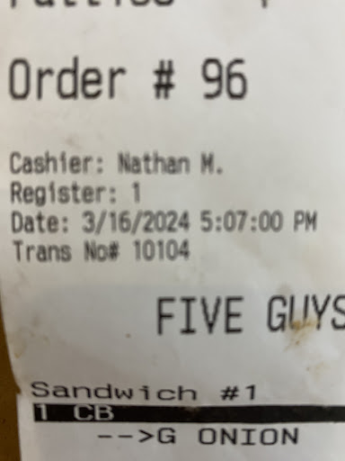 Overall, Nathan's professionalism, attention to detail, and genuine hospitality truly elevated our dining experience at Five Guys. Without a doubt, we'll be returning, and we hope to have the pleasure of being served by Nathan again. Five...