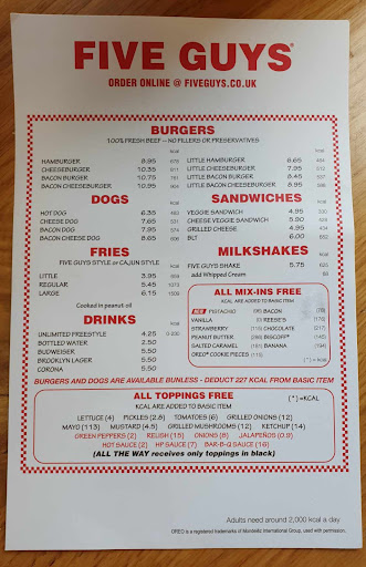 Read moreI have had to edit this review, as they have certainly improved. We have sat in the restaurant a couple of times now, there's always a bit of a wait but we expect that. Sitting in is definitely the preferred way to enjoy Five Guys. We ordered home delivery for the first time and they had adapted the bag so that the fries didn't get too soggy and the burgers were much nicer and tasted just like other branches. Well done!
