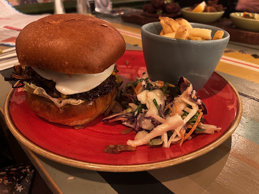 Read moreWhere do I start! Arrived at the obligatory sign "wait to be seated," and a couple of minutes later, a waitress appears, informing us of a 45-minute wait for food. Do we still want a table. The seating area didn't appear that busy, so we agreed to the wait. It was 1.30pm on New Years Eve, after all. We were seated at the worst positioned table I've ever had the misfortune to sit at. (By the bar where people stood to choose their meals/drinks and pay. Staff and other customers milling past constantly on either side of us. Customers standing with dogs, right next to the table.) Ordered a bottle of wine and waited for our food. 25 minutes later, the meal arrives. No finesse with the arrangement of food on the plate (I could have been sitting in a greasy spoon café on the A5 out of Cannock). The fries were luke warm and oily. The plantbased burger was slightly warmer with a limp piece of lettuce and cold slice of tomato. It came with a tea spoons' worth of coleslaw. I expected more from this establishment, reading some of the past reviews. Maybe that was the problem. Or is the problem the fact that the great British public are so accustomed to eating second class, unimaginative 'food' that they can't see or taste any difference! Incidentally, I gave two stars for service because at least one of the many staff members took the time...