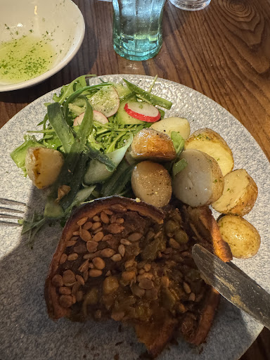 Read moreSecond time Iâve been here in two months and it hasnât improved. Itâs got worse! Last time after ordering a vegan meal which had to be changed as the wrong dressing had been mistakenly added to the salad, I ordered coffee but no alternative milk was available due to âthe order not coming in yetâ. This time I ordered a chickpea sandwich but unfortunately there were no chickpeas! Really? In a restaurant with chickpeas meals on the menu?! I reordered the vegetable tart which came with roast potatoes and salad. The tart pastry was hard and over browned, the potatoes were served in a bowl of oil and the salad consisted of rocket, baby spinach, slithers of cucumber rind and 1/2 a radish. So greens with a splash of pink. I asked for vegan mayo as the food was dry and they actually had some! A friend was also unhappy as the gourmet salad she ordered also contained chickpeas that were the main part of the salad. Potatoes were offered as an alternative. I asked if they had alternative milk this time and was told that no, it wasnât available because âout of 20 people who order tea or coffee, only one person has oat or soya so they end up throwing the rest awayâ so they hadnât got any. Overpriced...