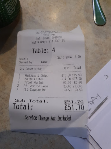 Read moreWent there for our 25th wedding anniversary. We had booked a table in advance but they couldn't find our reservation. They finally gave us a table but we were told to eat our meal within a certain time because they had another booking. The starter was lovely and it came quite quickly. Everything went downhill after that. The waitress was absolutely hopeless and uninterested. She brought us half of our main meal, placing the heavy plates of mussels at the top of the table so we had to move them in front of us ourselves. We then waited a few minutes for the rest of our meal and in the end, we had to ask for our chips and our bowl of lemon water ourselves before she brought them to us. There were too much mussels and not enough chips in our opinion but the white wine sauce was really lovely. Once we had finished eating, she came back and asked twice if we wanted a dessert. We said yes, twice. She said she would finish clearing our table before taking our order. She never came back to clear our table or to take our order. In the end, we asked another waitress for the dessert menu and the service greatly improved after that. Unfortunately, we found the Northumberland cheese board not very nice and expensive for what we got. Overall, the food was okay but a little expensive and the service wasn't great, which spoiled what should have been a lovely...