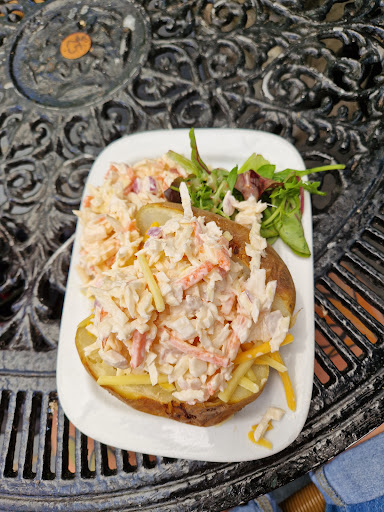 On my second visit to Grasemere Tea Gardens, I was pleasantly surprised. Due to the limited vegetarian options in the area, I decided to give the place another try. This time, I ordered the jacket potato with cheese and coleslaw, which was unavailable during my first visit. The jacket potato was fantastic—large, perfectly cooked, with a generous amount of delicious cheese and coleslaw that was almost as good as homemade. The accompanying salad with vinaigrette was once again a standout, particularly the mustard seeds, which were exceptional. I’d love to know more about them! Please reply to me with the name of those.