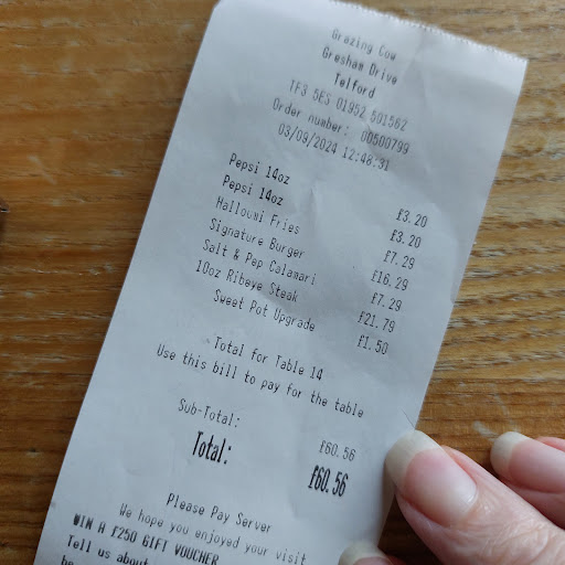 I wanted to raise this at the time but my Mrs really did not want me to cause a fuss, but what really gets me is other people will pay £22 for this. Even with a 40% off voucher I was annoyed. If you are going to post these vouchers around Telford the kitchen should expect to be busier than normal, so sending this hospital food is no excuse for me at all. I work as a chef not that it makes any difference so spotting the quality but I understand the demands of the job but there's absolutely no love whatsoever to what was thrown on that plate. Even the gravy was dropping out of the jug in clumps, because it had been left on the side too long and was going stodgy.