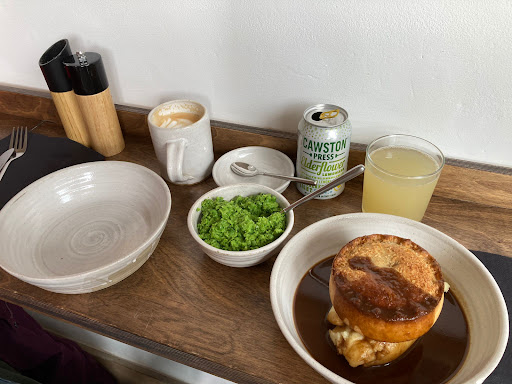 My wife and I happened upon this pie shop before a hike on a Thursday. It was a bit busy inside but the owner was very accommodating. We ordered the cheese and onion pie with mash, gravy and mushy peas to share, latte and softdrink £22. Whoever balanced these flavours is a true master of their craft. Every element complimented the other with deep richness. The peas took me by surprise. I have never encountered such a flavour profile. I had to ask for the recipe, which the owner humbly shared. My only regret is that we're only staying near Ambleside for one day. Also order a coffee he's mastered that craft...