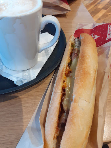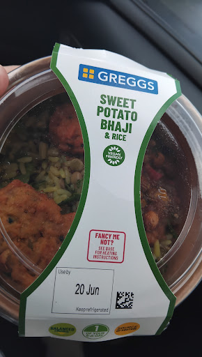 I love a bit of Greggs at lunchtime. I had the sweet potato bhaji & and rice. i think it is suitable for vegans. I always mainly pick this for lunch i I go into Greggs, Having more choice, but vegan food could have better chioce- getting there. I also had a shortbread heart jam biscuit. Yummy đ. Spot on for customer service. The atmosphere was buzzing, probably because it was 28°. Has a large parking area, but it gets packed quickly!...