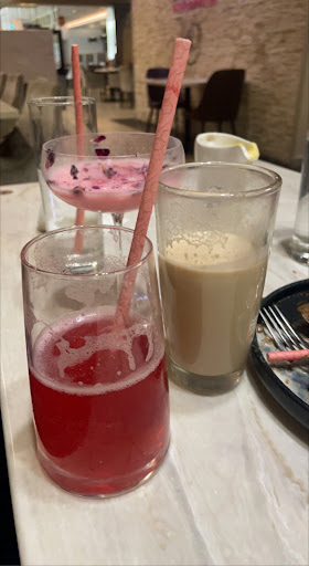 We ordered 2 drinks one strawberry milkshake and one mojito and 2 glasses of water with 2 deserts.